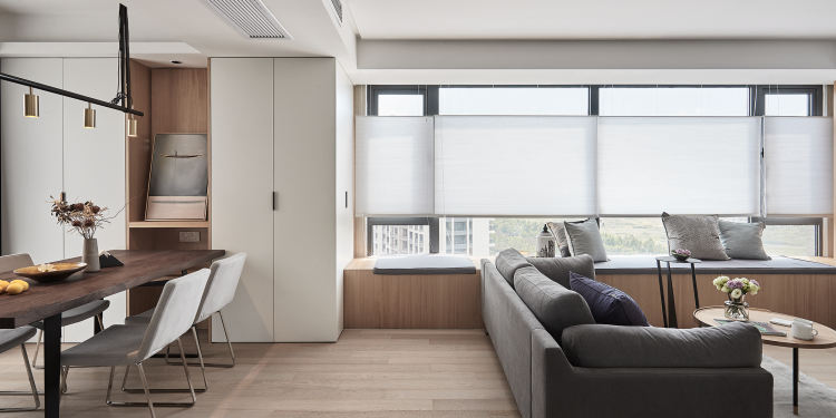 注意飘窗台面和电视墙的柜体结构穿插,整体简单纯粹,一气呵成,接口线整齐流畅,凸显出非常精致的工艺。